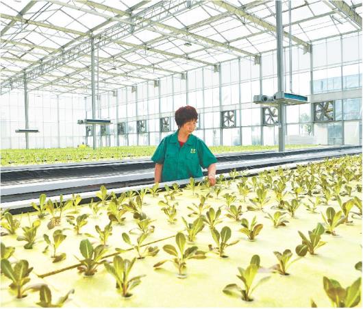 图:寿光田柳现代园区智能大棚内,工作人员正查看水培蔬菜长势。(□通讯员 李丹清 报道)