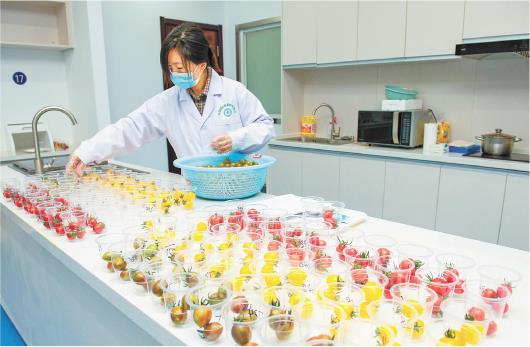 图:全国蔬菜质量标准中心工作人员正在准备口感番茄,供志愿者品尝,做感官实验。(□通讯员 李丹清 报道)