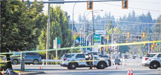 当地时间7月25日,在加拿大不列颠哥伦比亚省兰利,警察在枪击事件现场附近执勤。