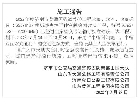 2022年度济南市普通国省道养护工程SG6 、SG7 、SG8 标段(S317 临历线历城枣林至仲宫段路面改造工程,桩号K182+ 683—K209+ 945)已经过山东省交通运输厅批准建设。该工程计划于2022年7月28日至10月30日,采用“半幅封闭施工,半幅路面双向通行”的交通组织方式,全路段禁止大型货车通行。