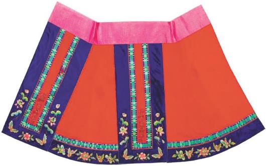 清 红色暗花绸堆绫盘金绣边饰马面裙 (民族服饰博物馆藏)
