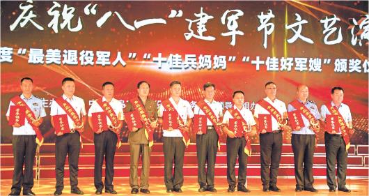 7月29日,青岛举行颁奖仪式,为曹同传等10名“最美退役军人”、宋永瑞等10名“十佳兵妈妈”、李涛等10名“十佳好军嫂”颁奖。图为2022年度青岛“最美退役军人”在领奖台上。