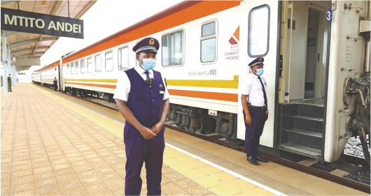 3月25日,在肯尼亚恩贡站,正司机约翰(左)和副司机布赖恩与站台工作人员确认安全。