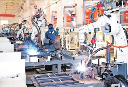 时风集团机器人自动化焊接生产线,技术人员正巡检机器人焊接情况。