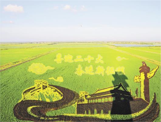 日前,一架试飞飞机从东营市垦利区永安镇稻田画上空掠过。目前,垦利区永安镇稻田画进入最佳观赏期,游客登上瞭望塔,欣赏着美丽的稻田画。