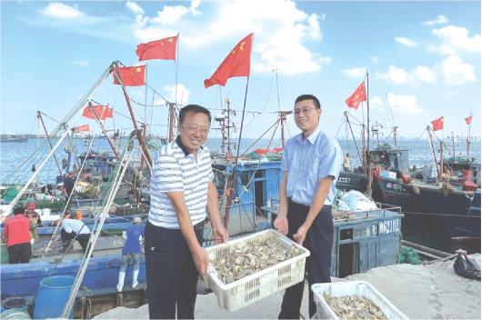 邮储银行山东省分行小微企业客户经理(右)走访服务当地海洋渔业。