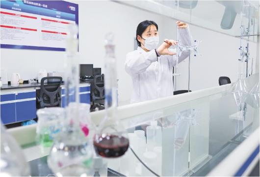 山东东珩国纤新材料有限公司胶体检测室内,工作人员在做滴定实验。