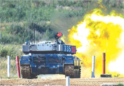 8月21日,在俄罗斯莫斯科州阿拉比诺靶场,中国参赛队96B坦克在比赛中。