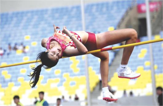 9月2日,省运会女子甲组跳高决赛在日照奎山体育中心体育场展开冠军争夺战。图为选手过杆时的精彩瞬间。