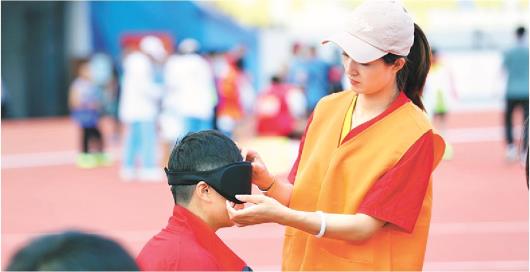在省第11届残运会比赛现场,有一群陪伴在盲人运动员身边的引导员,他们就像眼睛一样,帮助盲人运动员顺利完成比赛。