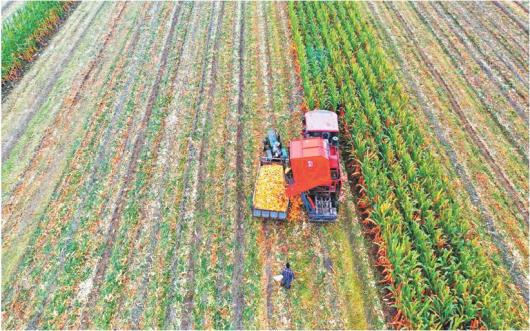 江北吨粮县桓台县,继夏粮小麦丰收后,金秋又迎玉米丰收。图为该县起风镇华沟村村民在用联合收割机收玉米。