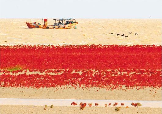 近日,在山东黄河三角洲国家级自然保护区,翅碱蓬给滨海滩涂湿地铺上“红地毯”。近年来,保护区坚持以生态的办法治理生态,实施湿地修复项目,达到“一次修复、自然演替、长期稳定”的良好湿地修复效果,河陆滩海复合湿地生态系统正在形成,黄河口新生湿地生态系统的原真性、完整性进一步增强。