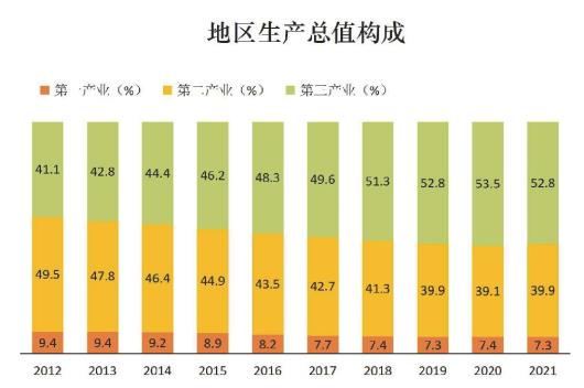 经济总量实现新跨越。2021年,全省实现生产总值83095.9亿元,首次突破8万亿元大关,是2012年的近2倍;全省人均GDP由2012年的44348元增加到81727元,年均增长6.5%。三次产业结构日趋优化。2021年三次产业之比为7.3∶39.9∶52.8,相比2012年,第三产业比重大幅提升11.7个百分点,服务业增加值对经济增长的贡献率由2012年的39.6%提升至59.5%。