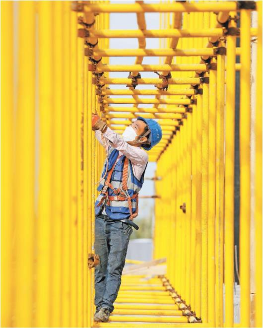 10月1日,中建八局四公司的建筑工人在青岛市即墨区龙山优质高中项目现场作业。我省各地劳动者坚守工作岗位,在忙碌中度过国庆假期。(□新华社发)