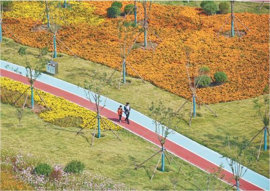金秋时节,郯城县市民休闲体育公园,五彩鲜花、百年古树、蜿蜒步道交织映衬,构成了一幅多姿多彩的生态画卷。