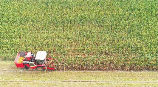 10月7日,枣庄市山亭区城头镇,连片玉米地中,农民驾驶大型收割机收获玉米。金秋时节,我省各地抢抓农时,合理高效使用农机,抢收玉米等秋粮作物,确保颗粒归仓。