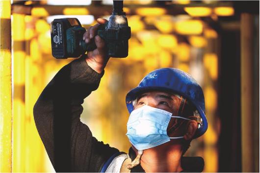 架子工用电动工具拧螺丝固定脚手架。每一个螺丝都关乎安全,容不得半点马虎。