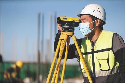 放线员屏气凝神,使用水平仪测量建筑标高。