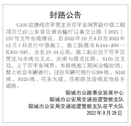 G105 京澳线茌平贾庄至茌平东阿界段中修工程项目已由山东省交通运输厅以鲁交公路〔2021〕137号文件批准建设,自2022年10月8日至2022年12月7日进行中修施工,施工段落为K 444+800—K455+ 340,全长10.54公里。施工起点位于茌平区贾庄与本线交叉点,向南与黑龙江路、S 105交叉后,止于茌平东阿界。本路线施工期间全幅封闭、禁止社会车辆通行。过往车辆可绕行G309 线、S242 线、S 325线、茌东大道、茌郝路及沿线其他县乡道路。