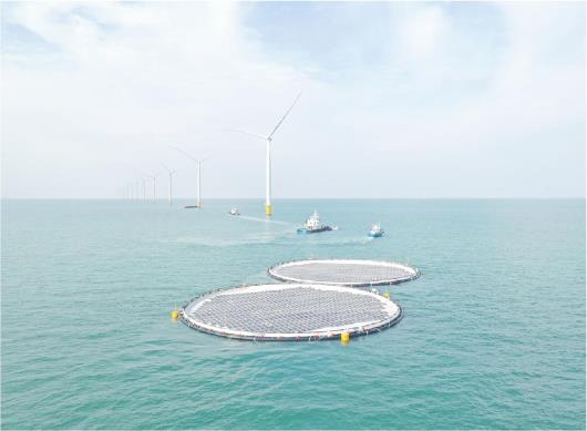 项目负责人介绍,海上光伏电站由环形抗风浪浮体、耐海洋环境高强弹性薄膜、光伏系统和风光送出系统等组成。其中,环形抗风浪浮体由高密度聚乙烯管件预制,高度0.6至0.8米,通过4个系泊点和12条缆索锚固于海床,与风机安全距离保持在60米以上;浮体中间安装新型光伏组件平台,依据海况采用定制化光伏发电组件,可减少波浪对光伏面板的冲击和腐蚀,同时,光伏组件采用预制滑轨与弹性薄膜连接,并通过薄膜直接与海水接触,水体对光伏设备的冷却可有效提高发电效率10%以上。