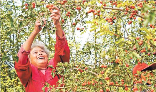 近日,枣庄市薛城区邹坞镇长峪山万亩林果长廊的山楂喜获丰收,果农们忙着收获劳动成果。缀满枝头的果实在蓝天白云的映衬下显得格外艳丽,火红的山楂也映红了农民的笑脸。