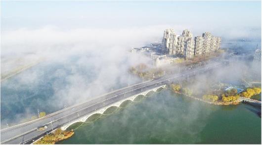 当日,“塞上湖城”宁夏银川上空出现平流雾景观,宛若仙境。