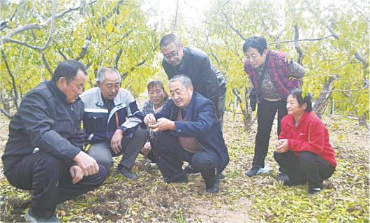 近日,滨州市沾化区黄升镇大姜村枣农姜竹廷为几名慕名前来学习的枣农讲解秋施“月子肥”技术。
