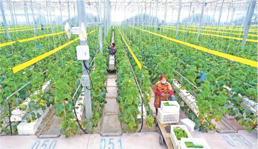 11月22日,聊城市茌平区贾寨镇耿店村现代农业示范园智能温室内,村民在采摘黄瓜。