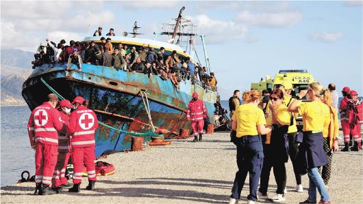 据希腊雅典-马其顿通讯社报道,一艘25米长的非法移民船21日晚在克里特岛以南18海里处发出求救信号,并告知救援人员船上有400至500人。当时事发海域有强风,救援条件较为恶劣。几艘正在同一海域航行的船只也参与了希腊海岸警卫队的救援行动。数小时后,这艘渔船被牵引到克里特岛一处港口停靠(上图)。