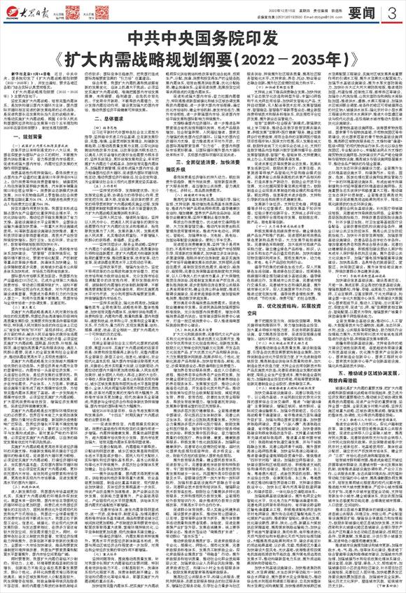 中共中央国务院印发《扩大内需战略规划纲要(2022-2035年)》