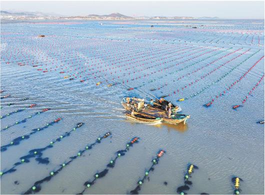 12月27日,在荣成市俚岛湾海洋牧场海上养殖区,渔民驾驶渔船出海作业。目前,荣成市各大海洋牧场贝类、藻类养殖正处于冬季管护期,渔民们驾驶渔船在海面上穿梭,呈现出一派“海上冬耕”的繁忙景象。