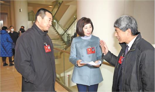 1月15日,会议间隙,李新峰(左)委员就自己提出的关于进一步提升我省重大科技项目立项质量的建议征求郑心(中)和刘磊(右)委员的意见。