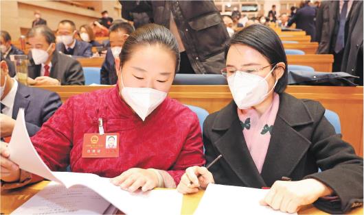 1月15日,出席省十四届人大一次会议的卞成飞(左)、赵东方代表,就非遗文化进校园、“山东手造”的品牌推广交流观点。