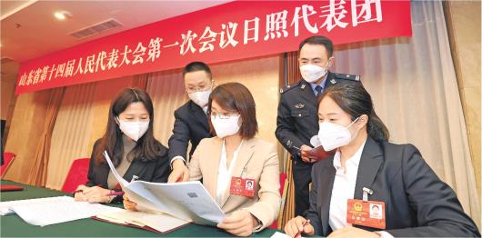 1月15日,出席省十四届人大一次会议的日照团代表杨冰(左起)、常彦磊、王媛媛、姜昊、刘英就大力发展乡村富民产业展开讨论。他们认为,应当发挥好日照的生态优势、文化优势和产业优势,大力发展乡村旅游,建设特色鲜明的乡村旅游目的地。