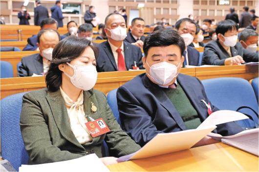 1月15日,出席省十四届人大一次会议的宋爱珍、时伟代表(从左至右),在会议间隙就持续深化农商行改革进行讨论。