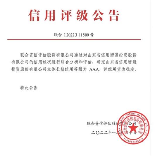 2022年12月,由鲁信集团牵头组建的省信用增进公司40亿元注册资本全部实缴到位并获AAA主体信用等级