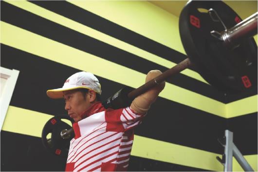 马明涛举杠铃练力量,为了以身作则带好训练,他坚持锻炼,保持运动状态。