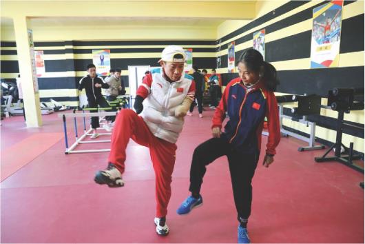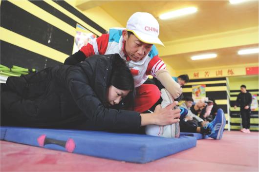 在位于阳信县城的滨州明涛体育训练中心训练室里,马明涛帮助队员陈银花(本文中残疾人运动员均为化名)作拉伸训练。陈银花(左)来自湖南,因事故失去了一只手。