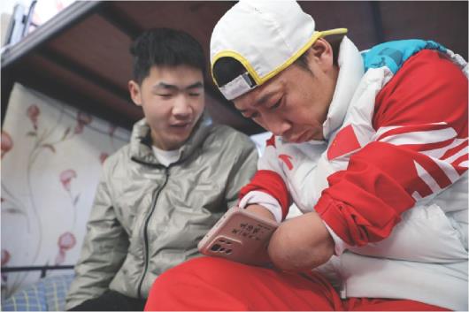 马明涛用手机打字,和聋哑队员徐天明(左)聊天。