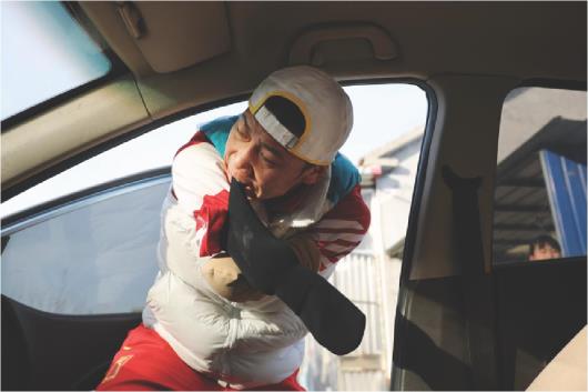 在自己的电动车内,马明涛用牙齿穿上胳膊布套,准备带队员们作户外训练。