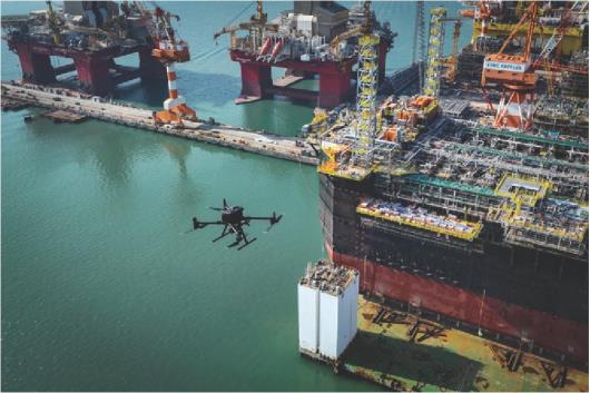 宫昕操控无人机对中集来福士烟台基地开展空中巡查。