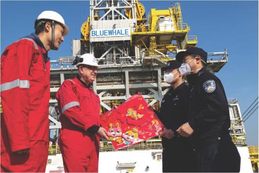 烟台港“蓝鲸二号”平台上,执勤一队民警为外籍船员送上代表春节祝福的大红“福”字。