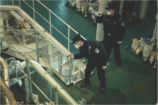 烟台港西港区320泊位,宫昕(左)带队对利比里亚籍达美轮进行夜间登轮检查。