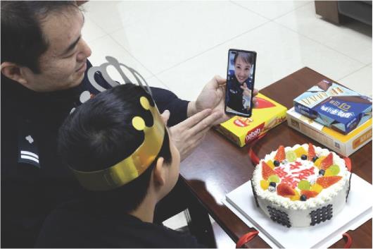 除夕夜,宫昕和儿子一起与妻子视频通话,妻子是宫昕的同事,当天在机关值班。