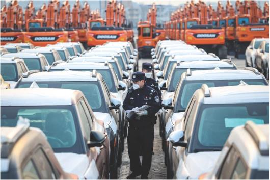 烟台港芝罘湾港区,宫昕的两位同事在成排待装船的出口车辆中进行边防检查。