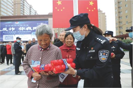 女警们在社区举办反诈宣传活动,为居民们准备了小礼品。