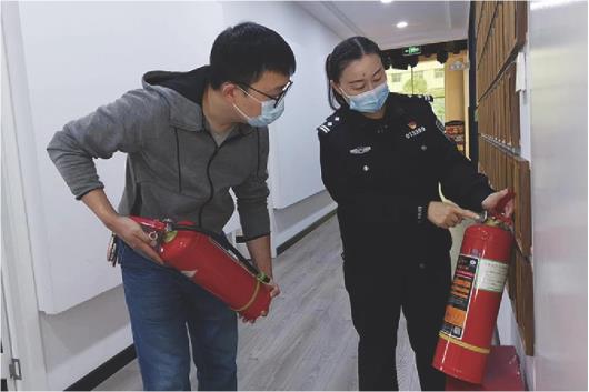 女警在社区检查消防设施,强化基层工作人员安全意识。