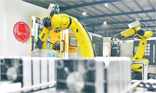 2月10日,郓城县一科技公司工业机器人在生产气动元件。