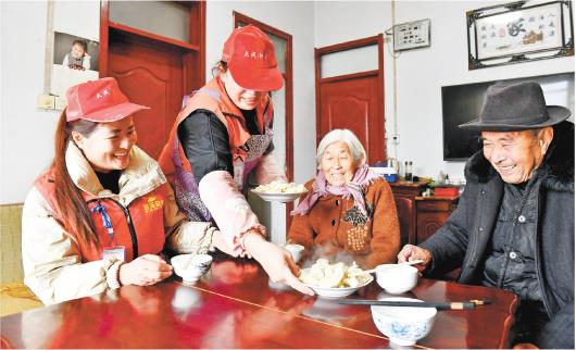 2月12日,在郓城县郓州街道王沙湾村,郓城县居家养老服务中心的工作人员为魏金兰(右二)、沈宜明(右一)端上饺子。