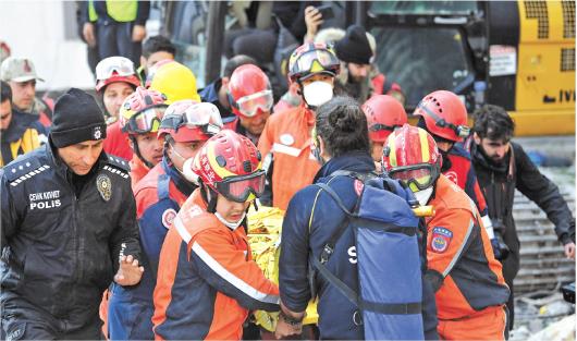 2月12日,在土耳其哈塔伊省安塔基亚市,中国救援队转移一名救出的幸存者。 □新华社发